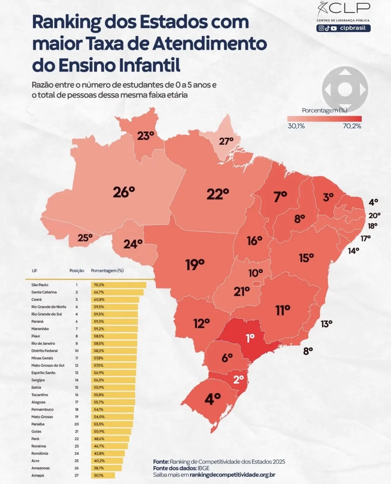 A taxa de atendimento representa a razão entre o número de crianças matriculadas na educação infantil — na faixa etária de 0 a 5 anos — e o total de pessoas dessa mesma idade em cada estado. O indicador integra o pilar de Educação do Ranking de Competitividade dos Estados e tem como base dados do Instituto Brasileiro de Geografia e Estatística (IBGE).