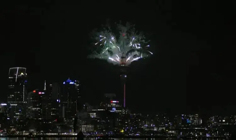 Fogos de artifício comemoram a chegada de 2026 em Auckland, na Nova ZelândiaImagem: Reprodução de vídeo