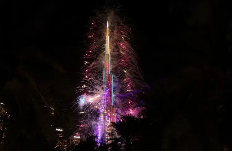Em Dubai, nos Emirados Árabes Unidos, fogos de artifício iluminaram a torre Burj Khalifa, a mais alta do planeta, para celebrar a chegada do novo ano.