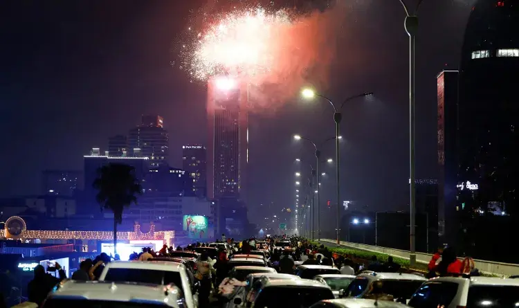 No trânsito, espectadores observam explosão de fogos de artifício sobre a torre de escritórios do Global Trade Center em Nairóbi, no QuêniaImagem: 31.dez.25 – Thomas Mukoya/Reuters