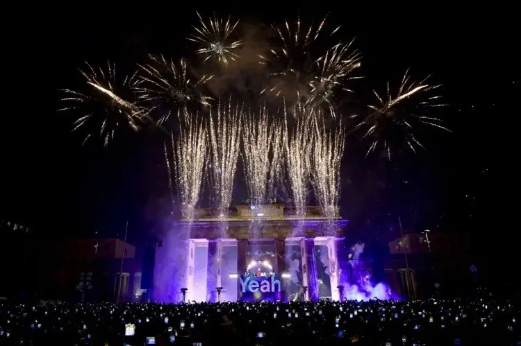 Público grava com os celulares a explosão de fogos de artifício no Portão de Brandemburgo, na celebração de 2026 em Berlim, na AlemanhaImagem: 31.dez.25 – John MACDOUGALL / AFP