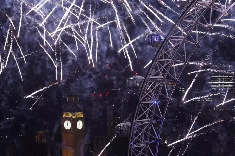 Show de fogos de artifício sobre o Big Ben, ao fundo, e a roda gigante London Eye, marcou a celebração de Ano-Novo em Londres, na Grã-BretanhaImagem: 31.dez.25 – Toby Melville/Reuters