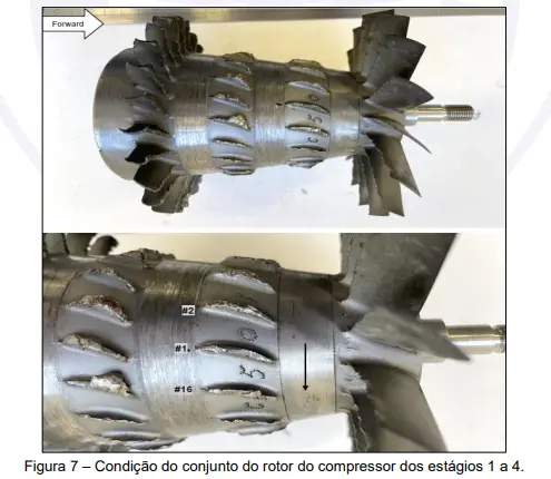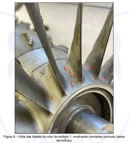 A investigação técnica apontou que a perda de potência esteve relacionada ao rompimento de uma blade – uma espécie de palheta, em linguagem popular – do segundo estágio do compressor do motor. Exames laboratoriais detalhados, como microscopia eletrônica de varredura e análises químicas, indicaram que a fratura foi provocada por um processo de fadiga iniciado em pontos de corrosão, com múltiplas origens. A separação dessa blade resultou na liberação de outras pás dos estágios seguintes, causando danos internos significativos ao motor.