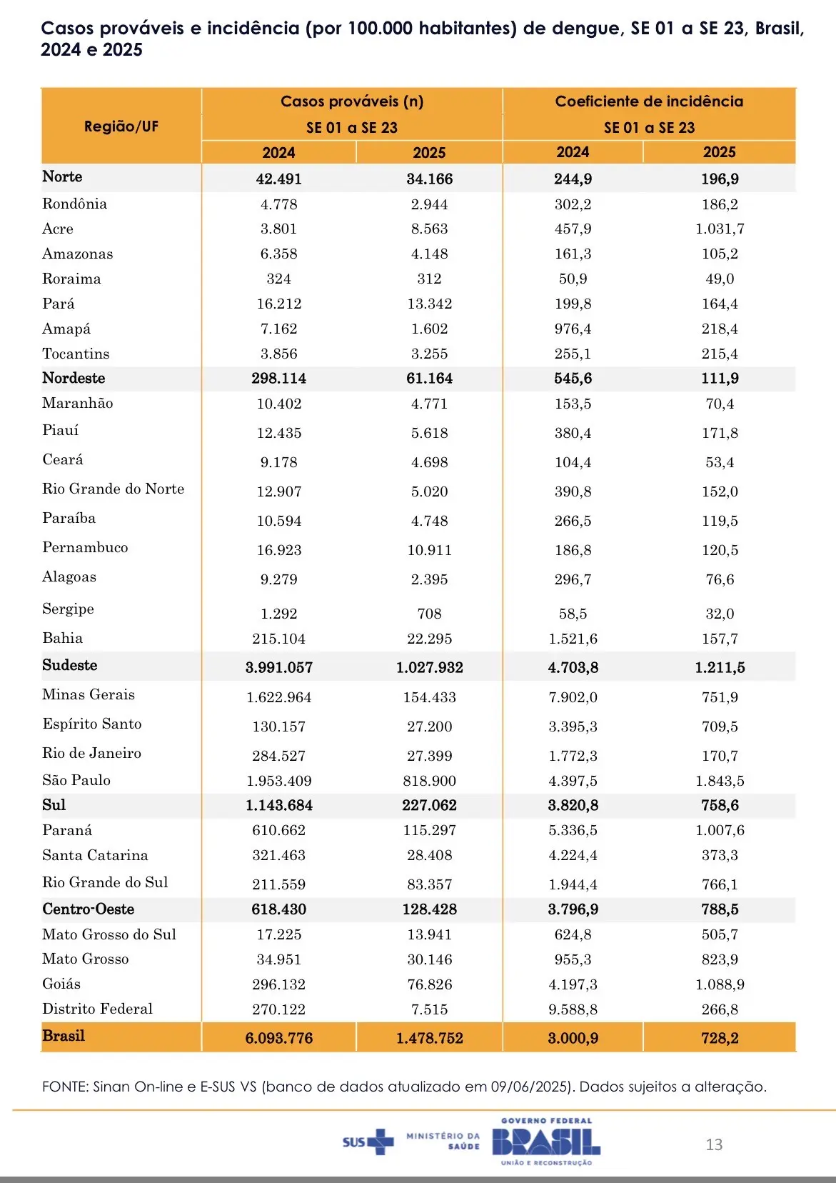 No Acre, foram registrados 8.563 casos prováveis de dengue entre as semanas 01 e 23 de 2025. O estado apresentou coeficiente de incidência de até 1.031,7 casos por 100 mil habitantes, colocando-o entre os mais afetados proporcionalmente no país no período analisado.