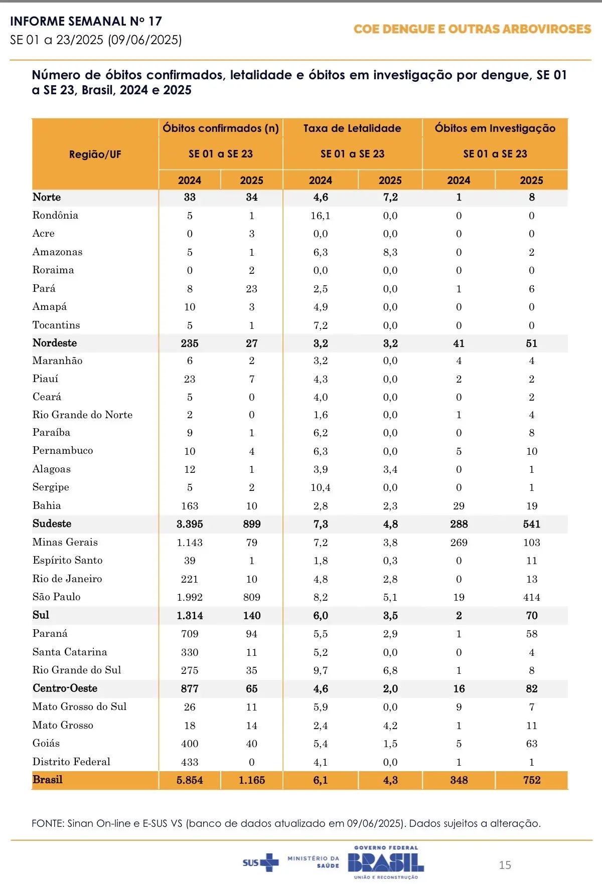 No cenário nacional, os casos graves se concentram principalmente nas regiões Sudeste, Sul e Centro-Oeste, enquanto a maior parte dos óbitos foi registrada no Sudeste. Ao todo, o Brasil confirmou 1.165 mortes por dengue no período analisado, com outros 752 óbitos ainda sob investigação.
