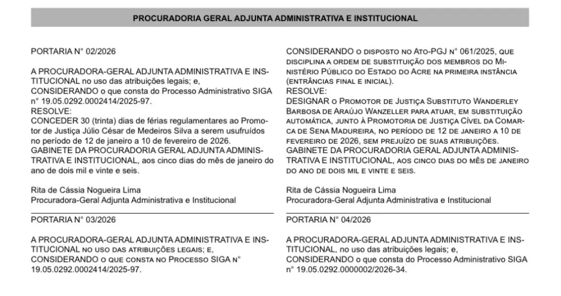 O Ministério Público do Estado do Acre (MPAC) definiu quem ficará responsável pela Promotoria de Justiça Cível da Comarca de Sena Madureira durante o período de férias do titular. A medida consta na Portaria nº 02/2026, assinada pela procuradora-geral adjunta administrativa e institucional, Rita de Cássia Nogueira Lima.