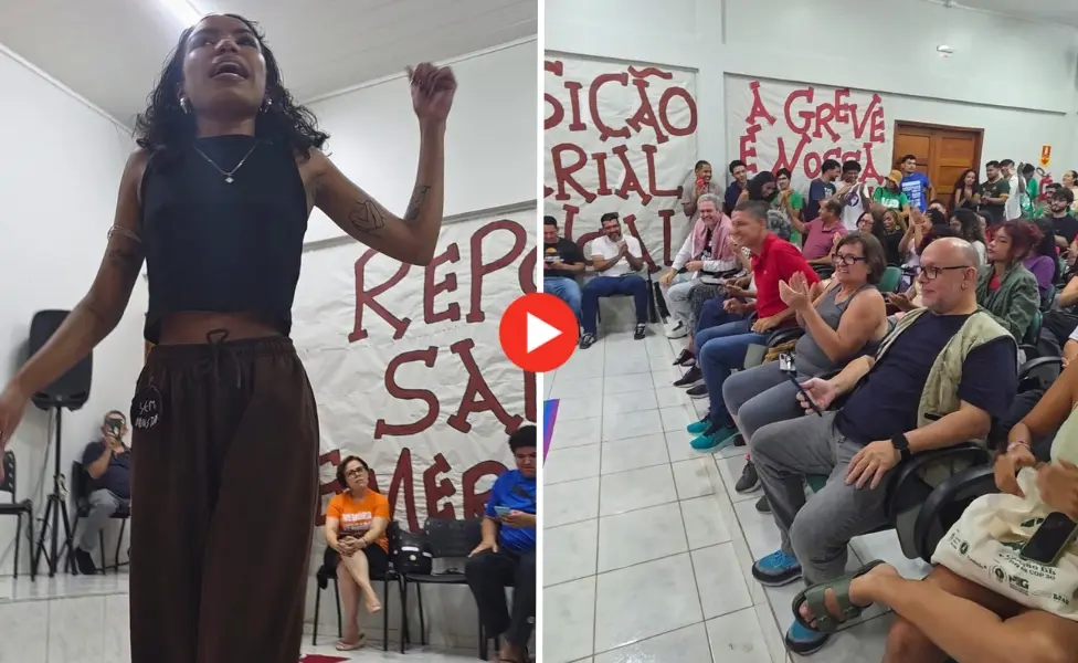 Cristina Santos é estudante da Ufac, secretária do Diretório Central dos Estudantes (DCE) e secretária da Juventude do Partido dos Trabalhadores (JPT) no Acre. A apresentação ocorreu em um auditório lotado, decorado com faixas de entidades sindicais e estudantis, como ANDES, UNE e UJC.
