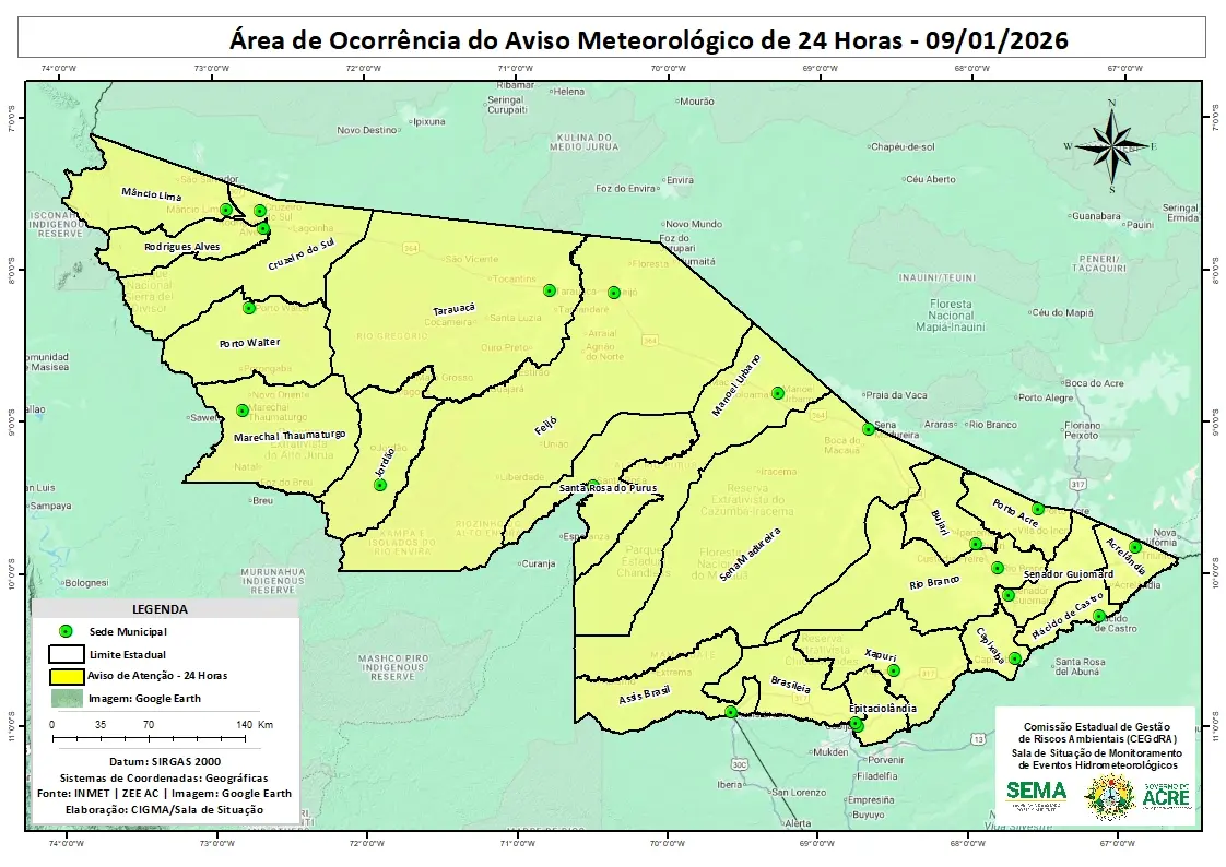 O Instituto Nacional de Meteorologia (Inmet) emitiu nesta sexta-feira, 09, um aviso meteorológico de chuvas intensas para o estado do Acre. O alerta é classificado como de perigo potencial (nível amarelo) e tem validade das 9h22 até as 23h59 do mesmo dia.