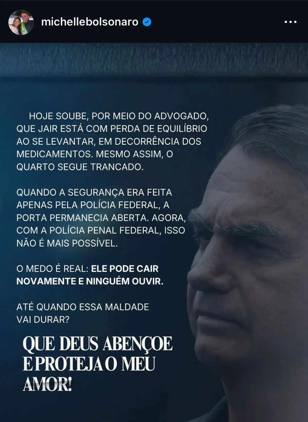 “Hoje soube, por meio do advogado, que Jair está com perda de equilíbrio ao se levantar, em decorrência dos medicamentos. Mesmo assim, o quarto segue trancado. Quando a segurança era feita apenas pela Polícia Federal, a porta permanecia aberta. Agora, com a Polícia Penal Federal, isso não é mais possível. O medo é real: ele pode cair novamente e ninguém ouvir. Até quando essa maldade vai durar? Que Deus abençoe e proteja o meu amor”, diz a publicação.