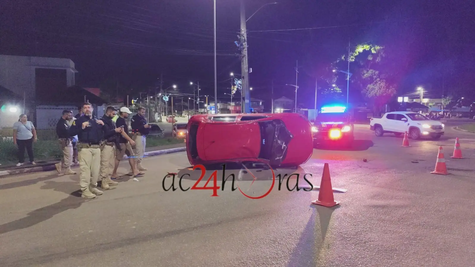 Um acidente de trânsito envolvendo dois veículos deixou uma idosa e um homem com escoriações, além de um carro tombado, na noite desta segunda-feira (12), na Via Verde, na rotatória da Corrente, BR-364, no Segundo Distrito de Rio Branco.
