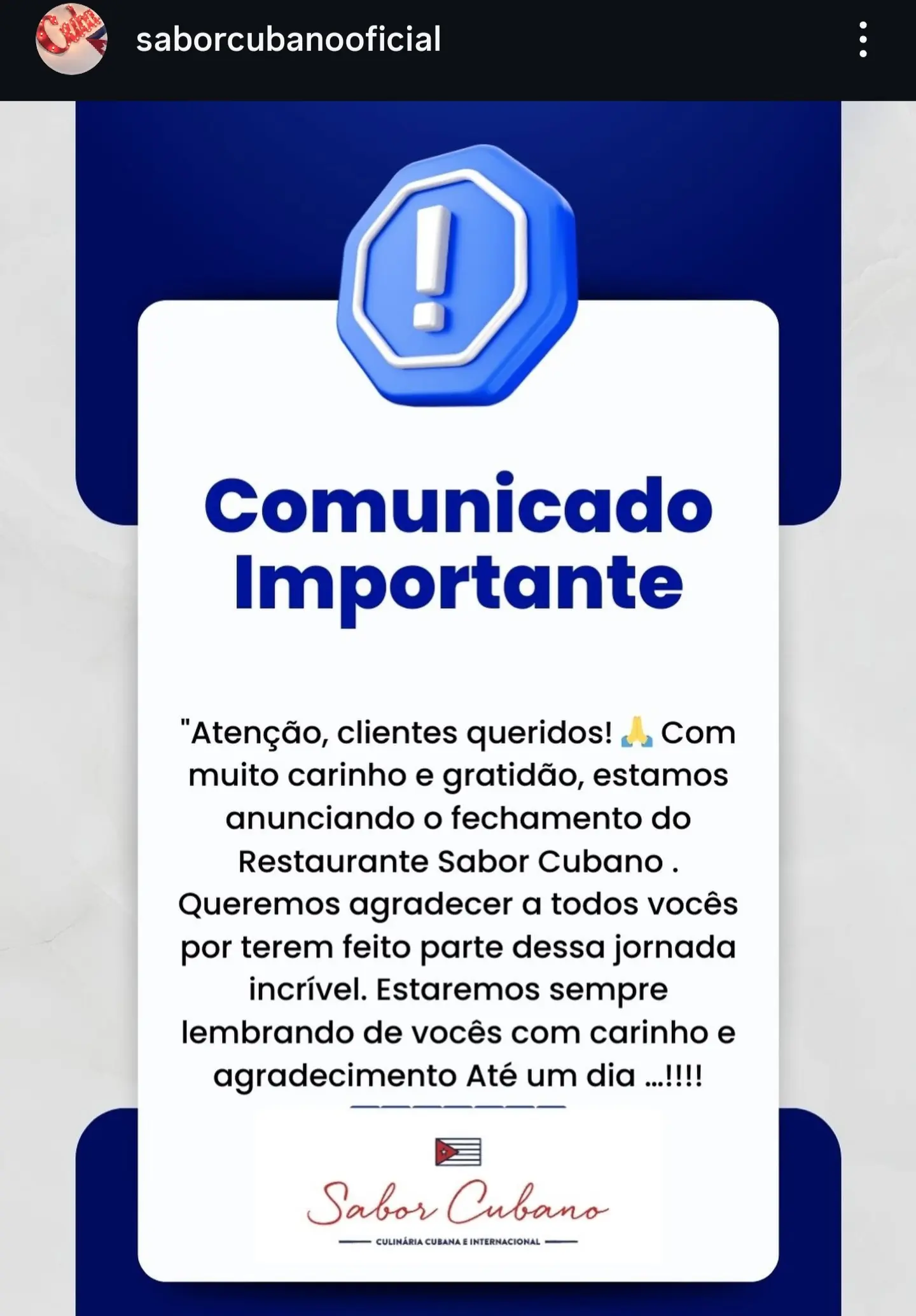 Na publicação, a equipe do restaurante agradeceu ao público que acompanhou a trajetória do Sabor Cubano ao longo dos anos e destacou o sentimento de gratidão pela jornada construída. “Com muito carinho e gratidão, estamos anunciando o fechamento do Restaurante Sabor Cubano. Queremos agradecer a todos vocês por terem feito parte dessa jornada incrível. Estaremos sempre lembrando de vocês com carinho e agradecimento. Até um dia”, finalizou.