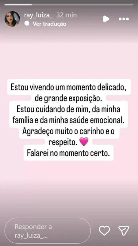 “Estou vivendo um momento delicado de grande exposição. Estou cuidando de mim, da minha família e da minha saúde emocional. Agradeço muito o carinho e o respeito. Falarei no momento certo.”