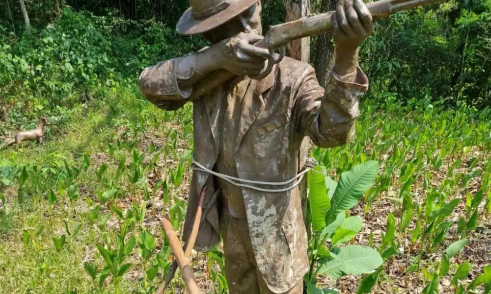 O cenário de degradação atinge ainda as esculturas, que apresentam danos visíveis e, em alguns casos, estão amarradas com fios e tacos de madeira para permanecerem em pé. O túmulo simbólico do líder revolucionário também está coberto pelo mato.