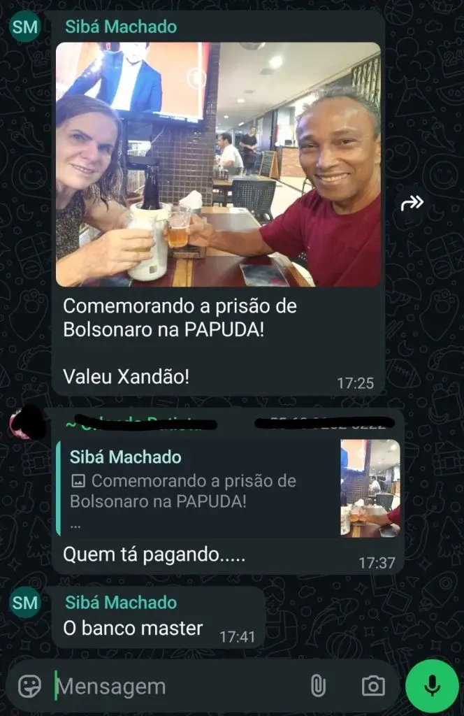Em uma imagem compartilhada no grupo, Sibá aparece ao lado da esposa em clima de celebração. Na legenda da foto, o petista exaltou a decisão do ministro Alexandre de Moraes, do Supremo Tribunal Federal (STF), responsável por determinar a transferência do ex-mandatário, da Polícia Federal para o sistema penitenciário do Distrito Federal. “Comemorando a prisão de Bolsonaro na PAPUDA! Valeu Xandão”, escreveu Machado.