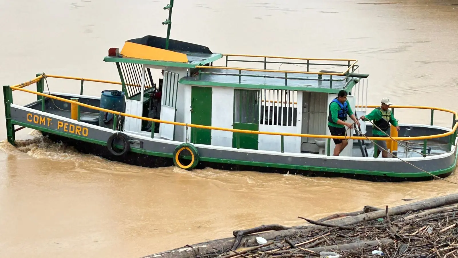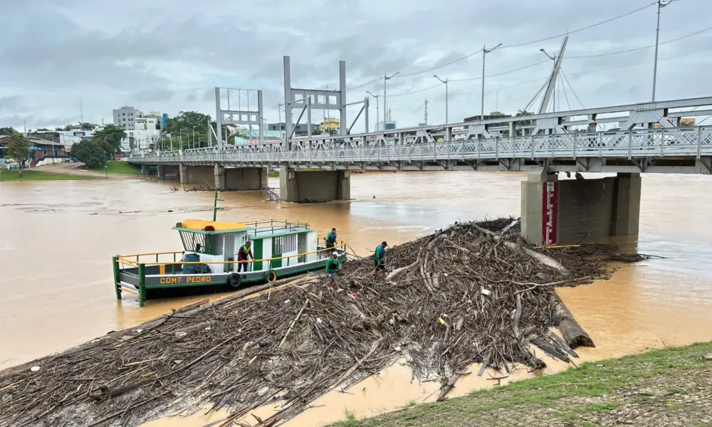 Equipes do Departamento de Estradas de Rodagem do Acre (Deracre) intensificaram, na manhã desta sexta-feira, 16, os trabalhos de retirada de balseiros acumulados na ponte Juscelino Kubitschek, conhecida como ponte metálica, no centro de Rio Branco. A operação é realizada com apoio da embarcação Capitão Pedro, que atua diretamente na remoção do grande volume de troncos e galhadas concentrados nos pilares da estrutura.