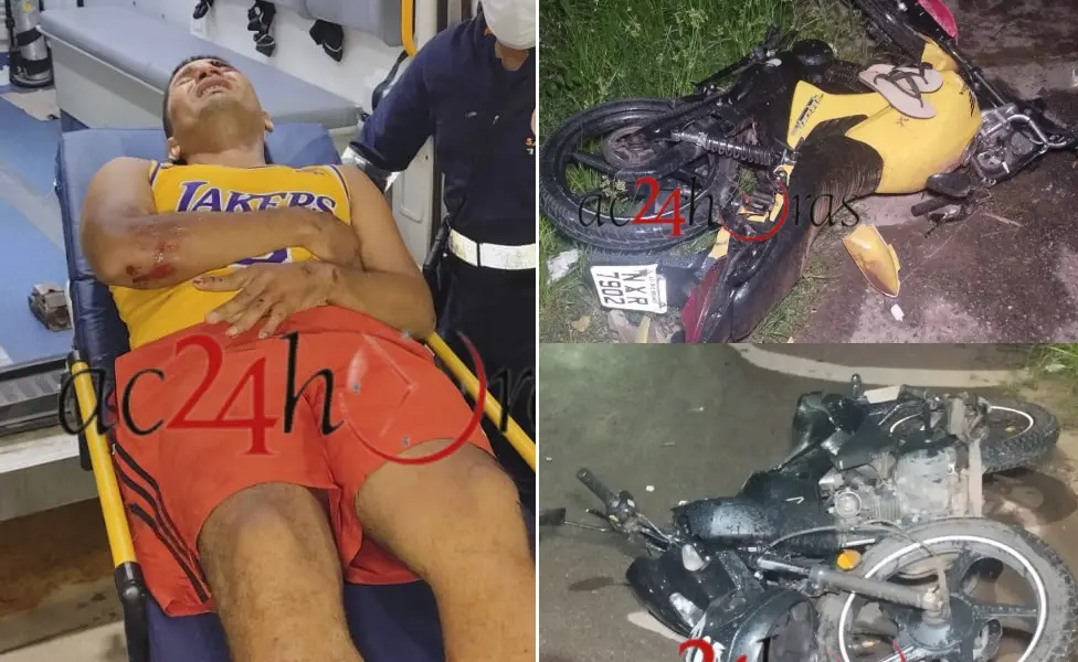 Um acidente de trânsito envolvendo duas motocicletas deixou o motoboy Osmildo Paiva Melo, de 34 anos, com fratura, e Romário Pereira dos Santos com escoriações, na noite deste sábado (17), no cruzamento das ruas El Salvador e Sérvia, no bairro Cabreúva, em Rio Branco (AC).