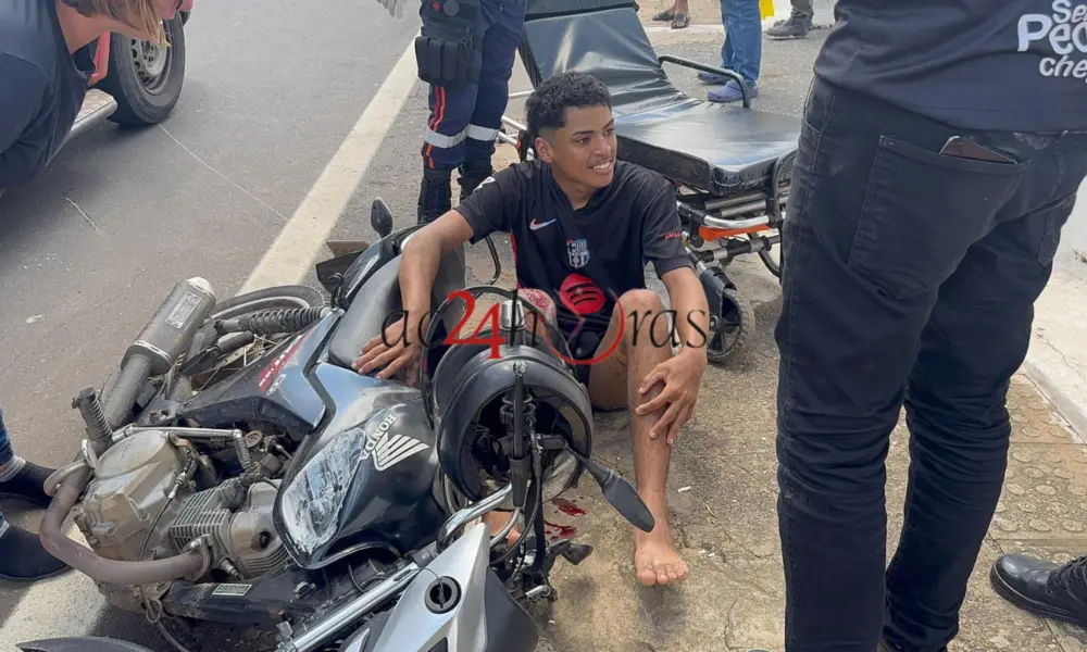 O entregador de aplicativo Matheus Lima, 20 anos, ficou ferido após colidir a motocicleta que conduzia na traseira de um ônibus do transporte coletivo, no início da tarde desta segunda-feira (19), na Rua Rio de Janeiro, bairro Dom Giocondo, em Rio Branco (AC).