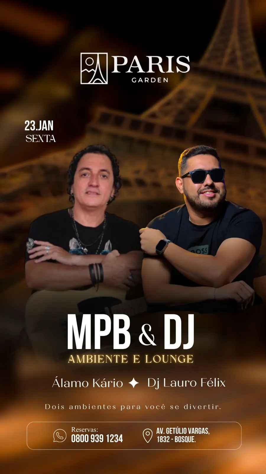 O restaurante Paris Garden realiza nesta sexta-feira, 23, uma programação especial voltada ao público que aprecia música brasileira e ambiente lounge em Rio Branco. O evento “MPB & DJ – Ambiente e Lounge” contará com apresentação do músico Álamo Kário e discotecagem de DJ Lauro Félix, reunindo dois estilos musicais em ambientes distintos no mesmo local.