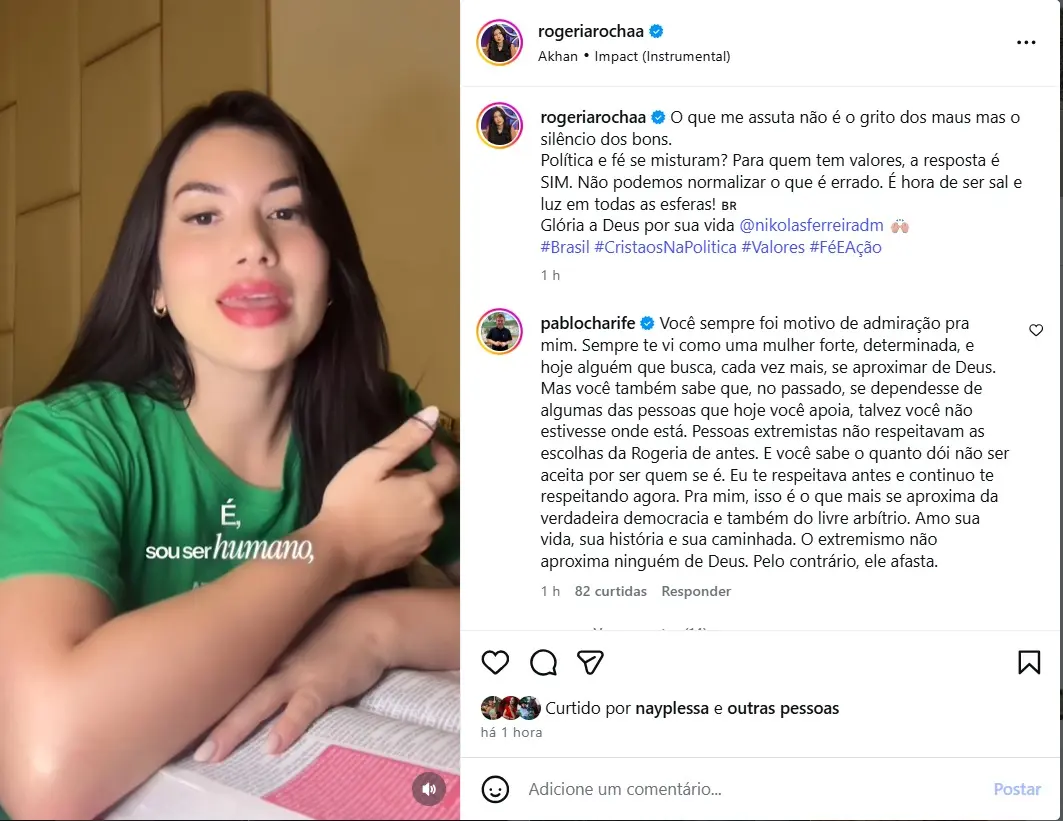 Após a repercussão negativa, Rogéria Rocha voltou a se manifestar e rebateu as críticas. “Antes de falarem em propagação de ódio, é só olharem os comentários para verem quem realmente está fazendo isso. Esse é o meu posicionamento. Se você não concorda, eu respeito e peço o mesmo respeito”, declarou. A influenciadora finalizou reforçando sua fé: “Cristo sempre será o centro da minha vida. Não é sobre idolatria, é sobre aquilo em que acredito”.