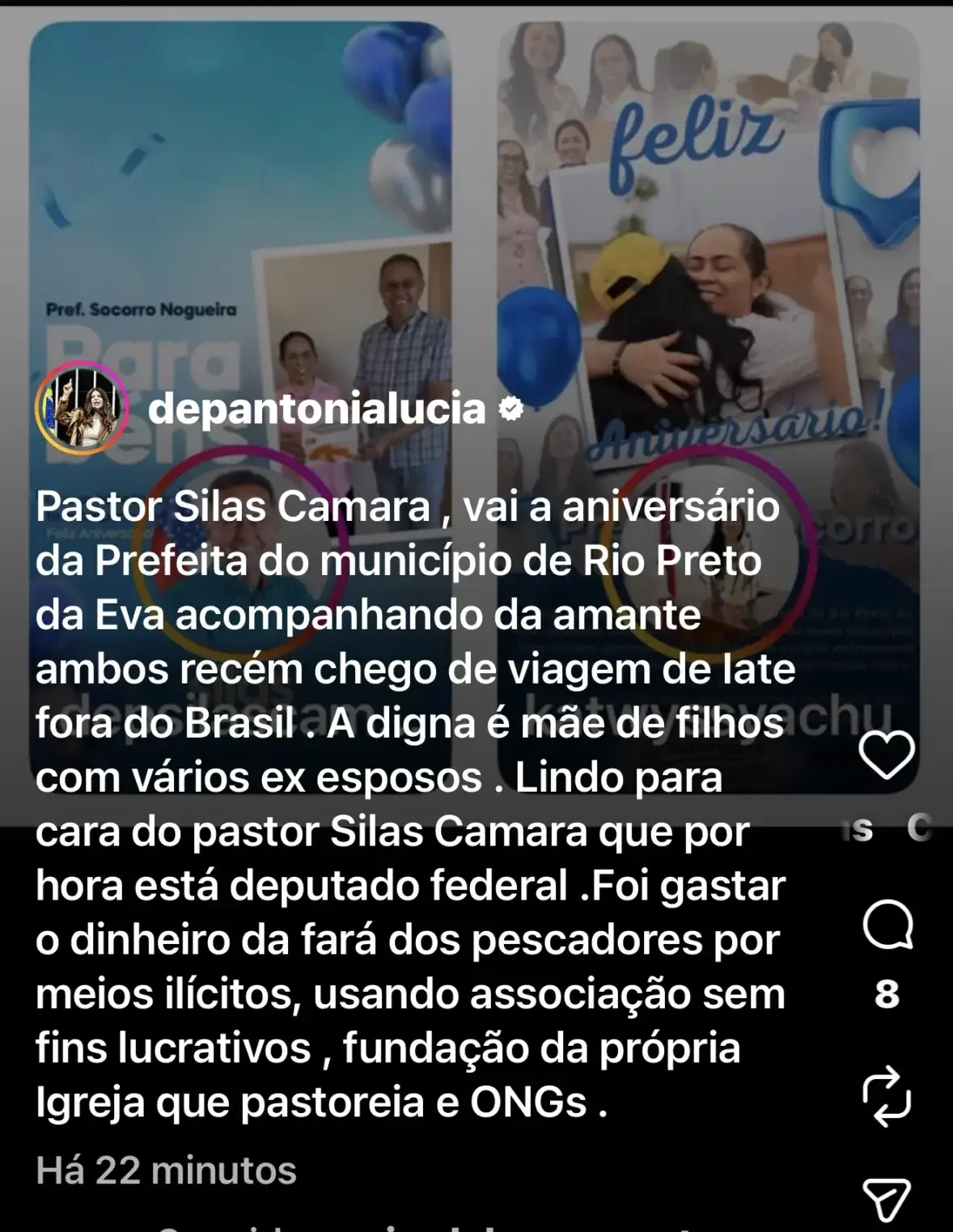“Pastor Silas Camara vai a aniversário da prefeita do município de Rio Preto da Eva acompanhando da amante, ambos recém-chegados de viagem de iate fora do Brasil”, escreveu a deputada.