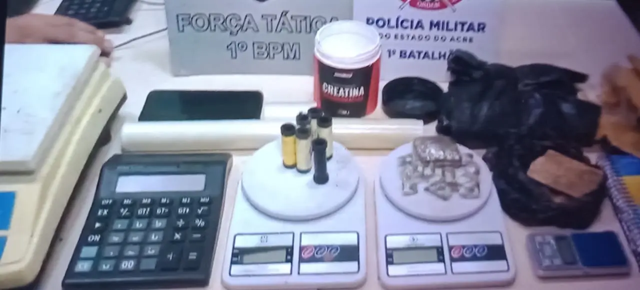 Durante as buscas na casa, os policiais apreenderam um pote contendo papelotes de cocaína, uma pedra de crack pesando cerca de 250 gramas, 14 tabletes de maconha do tipo skunk, duas balanças de precisão, material para embalo de drogas e outros objetos.