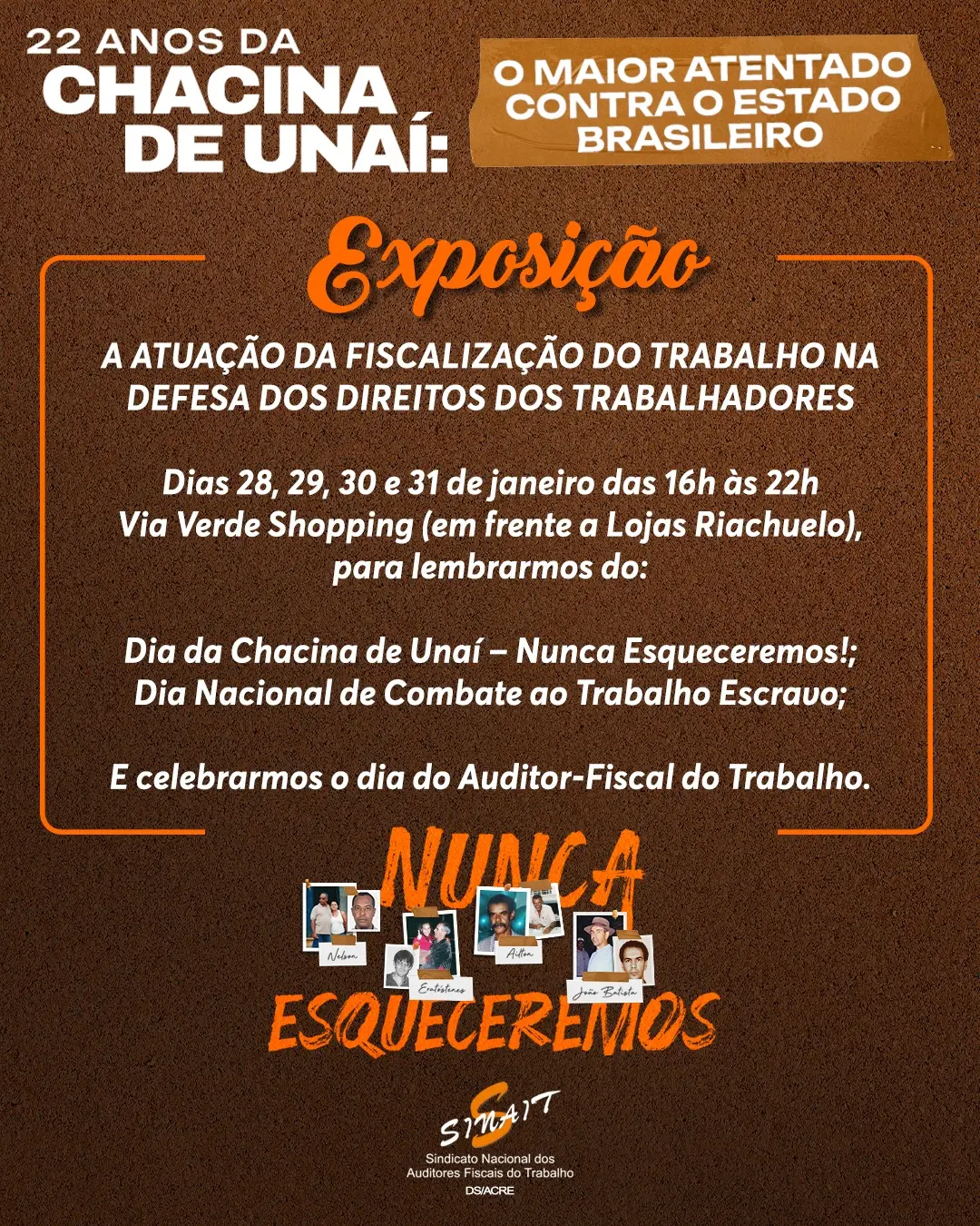 Entre os dias 28 e 31 de janeiro, o Via Verde Shopping, em Rio Branco, recebe a exposição “A atuação da fiscalização do trabalho na defesa dos direitos dos trabalhadores”, promovida pela Delegacia Sindical do Sindicato Nacional dos Auditores-Fiscais do Trabalho (SINAIT) no Acre. A iniciativa ocorre em frente às Lojas Riachuelo e marca a celebração do Dia do Auditor-Fiscal do Trabalho e do Dia Nacional de Combate ao Trabalho Escravo, em memória da Chacina de Unaí, ocorrida em 2004, quando três auditores-fiscais do Trabalho e um motorista do Ministério do Trabalho foram assassinados durante uma fiscalização que investigava denúncias de trabalho análogo à escravidão na zona rural de Minas Gerais.