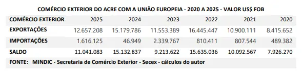 A tabela a seguir, evidencia que o comércio exterior do Acre com a União Europeia manteve-se estruturalmente superavitário entre 2020 e 2025, consolidando o bloco como parceiro relevante na geração de divisas para o estado. As exportações oscilaram de US$ 8,4 milhões, em 2020, para um pico de US$ 16,4 milhões, em 2022, recuando para US$ 12,6 milhões em 2025, mas permanecendo em patamar superior ao início da série. As importações, por sua vez, apresentaram valores bem menores e mais voláteis, com destaque para 2023, quando atingiram US$ 2,3 milhões, após níveis inferiores a US$ 1 milhão nos anos anteriores.