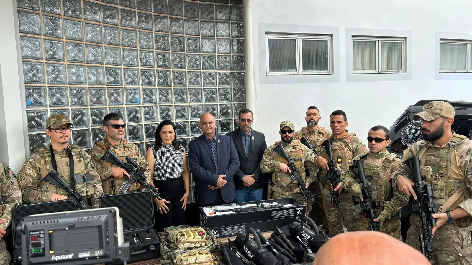 Entre os recursos entregues estão 04 viaturas semibrindadas, 02 drones Mavic 3T, uma lancha de patrulha, fuzis e pistolas de airsoft para treinamento, kits de arrombamento, mochilas de sobrevivência, kits de APH e demais equipamentos para reforçar a atuação da Coordenadoria de Recursos Especiais (CORE).