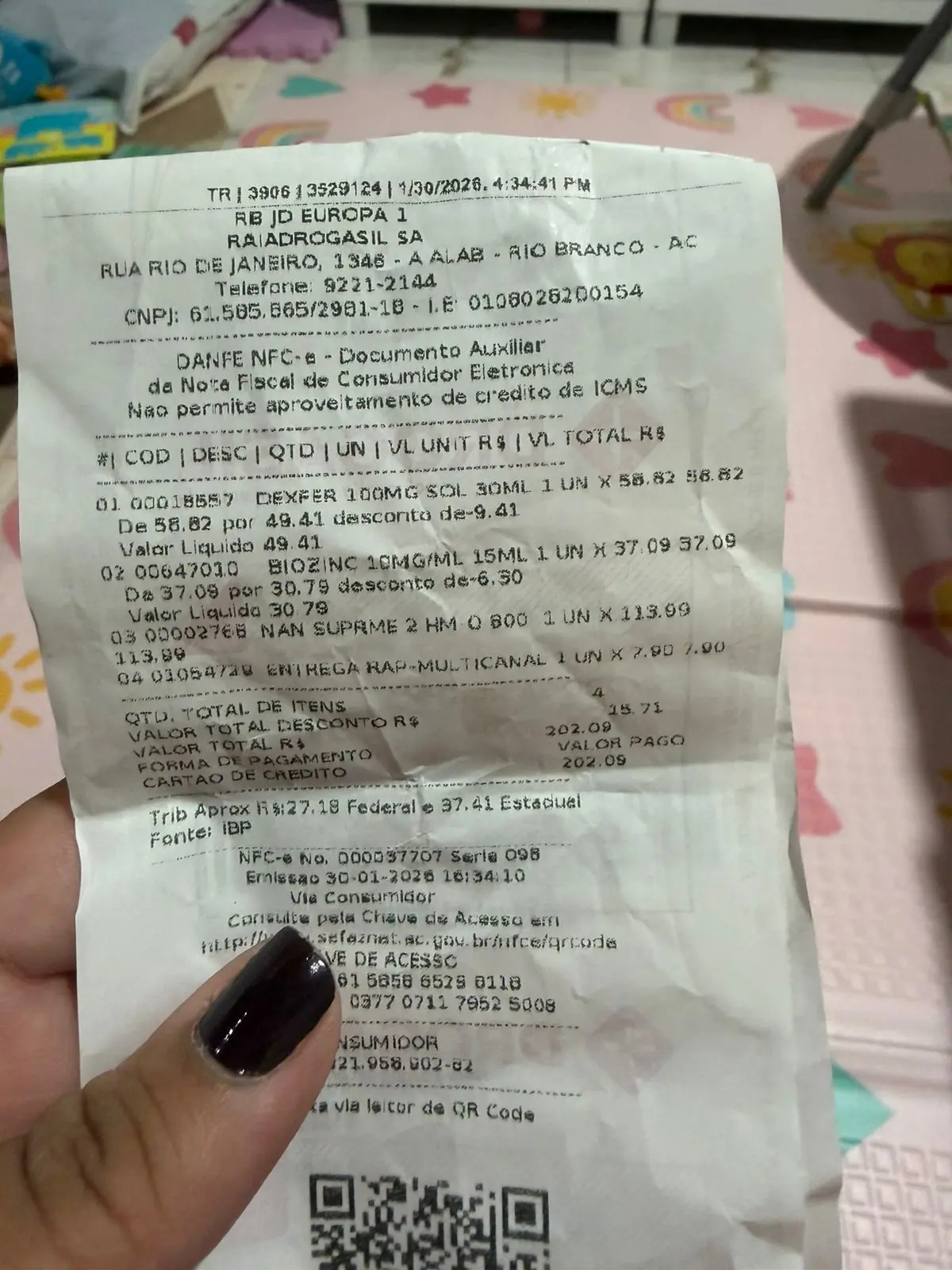 Uma consumidora de Rio Branco passou por um susto ao perceber que uma fórmula infantil adquirida por aplicativo fazia parte de um recall nacional da marca Nestlé. O produto é a Fórmula Infantil NAN Supreme 2 HMO Nestlé, indicada para crianças de 6 a 12 meses, lata de 800 gramas, comprada na última sexta-feira (30) na Drogasil, unidade localizada na Rua Rio de Janeiro, nº 1346, no bairro Jardim Alah, em Rio Branco.