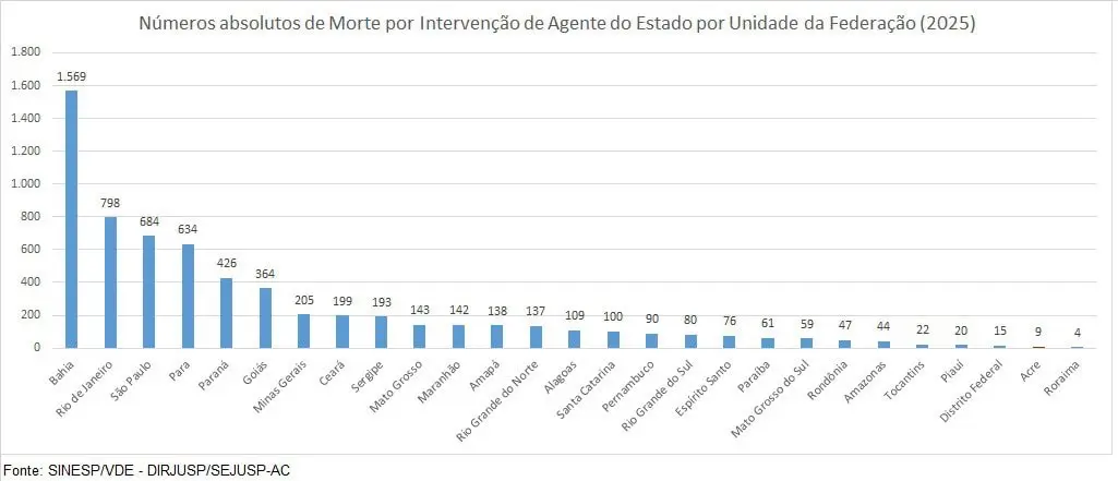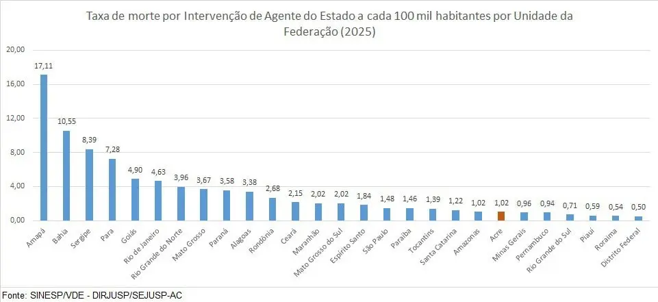 O Acre apareceu, em 2025, entre os estados com menor taxa (1,2) de letalidade policial do país, ocupando a sétima posição no ranking nacional quando considerados os registros proporcionais por 100 mil habitantes, segundo dados Diretoria de Inteligência da Secretaria de Estado de Justiça e Segurança Pública (Sejusp).