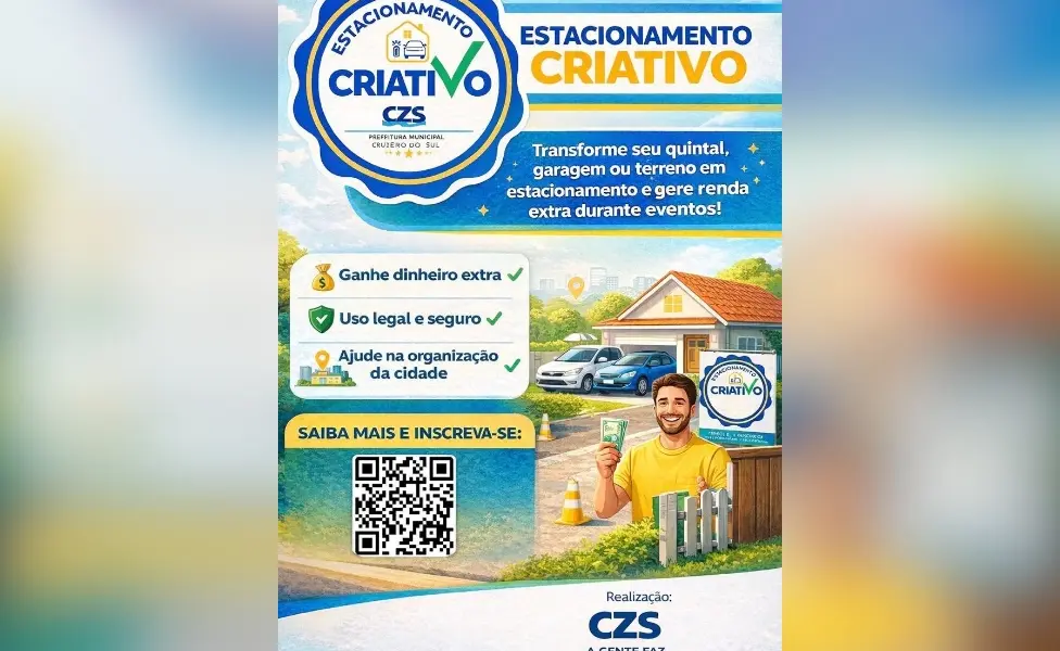 A prefeitura de Cruzeiro do Sul, por meio da Secretaria Municipal de Desenvolvimento Econômico e Turismo, lançou o programa ‘Estacionamento Criativo’ para o Carnaval Cultural Magid Almeida, que ocorrerá de 14 a 17 de fevereiro, no centro da cidade. As inscrições iniciaram nesta quarta-feira, 4, e seguem até o dia 12, por meio do Instagram da secretaria, com o objetivo de organizar o trânsito, ampliar as opções de estacionamento e gerar renda extra para a população.