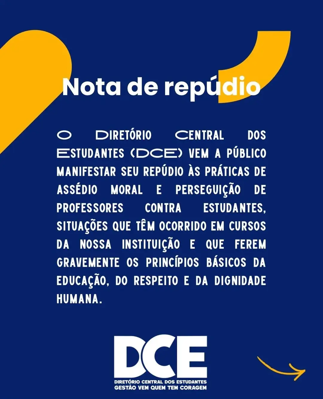 Na manifestação, o DCE reafirma seu compromisso com a defesa dos direitos estudantis, da liberdade de expressão e do acesso a um ensino de qualidade, além de se colocar como espaço de escuta, acolhimento e mobilização.