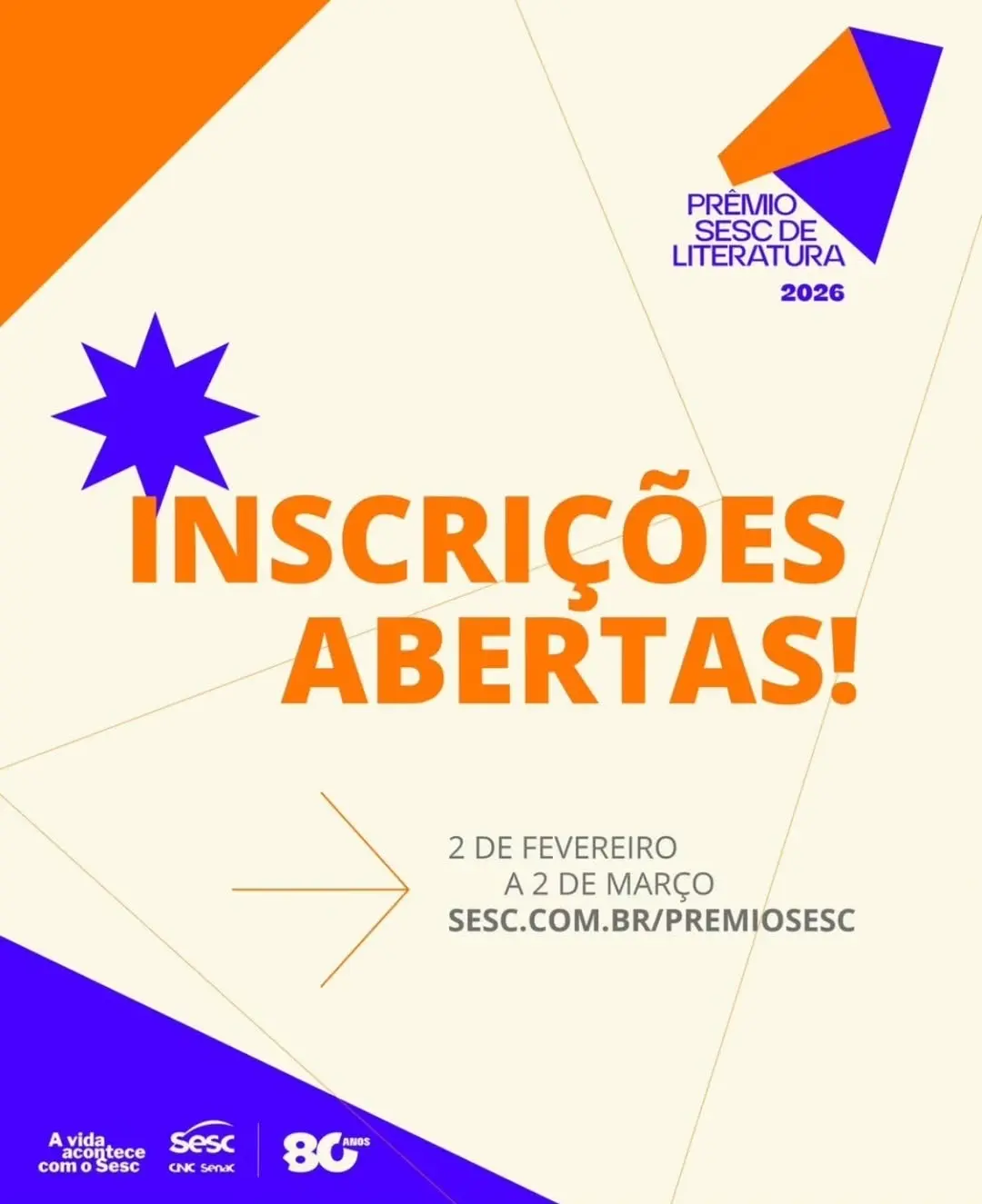 Estão abertas até o dia 2 de março as inscrições para o Prêmio Sesc de Literatura 2026, uma das principais premiações voltadas a escritores inéditos no país. Autores de todo Brasil podem participar gratuitamente.