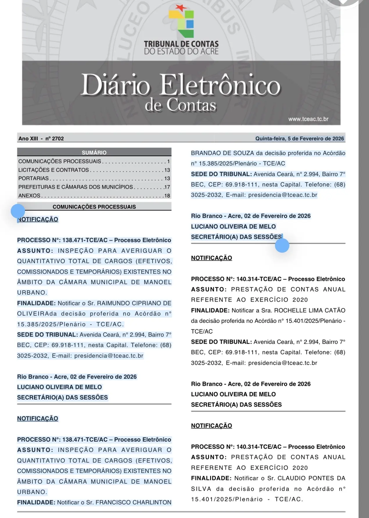 O Tribunal de Contas do Estado do Acre (TCE-AC) publicou no Diário Eletrônico desta quinta-feira, 5, notificações relacionadas ao Processo nº 138.471-TCE/AC, que trata de uma inspeção realizada para averiguar o quantitativo total de cargos efetivos, comissionados e temporários existentes no âmbito da Câmara Municipal de Manoel Urbano.