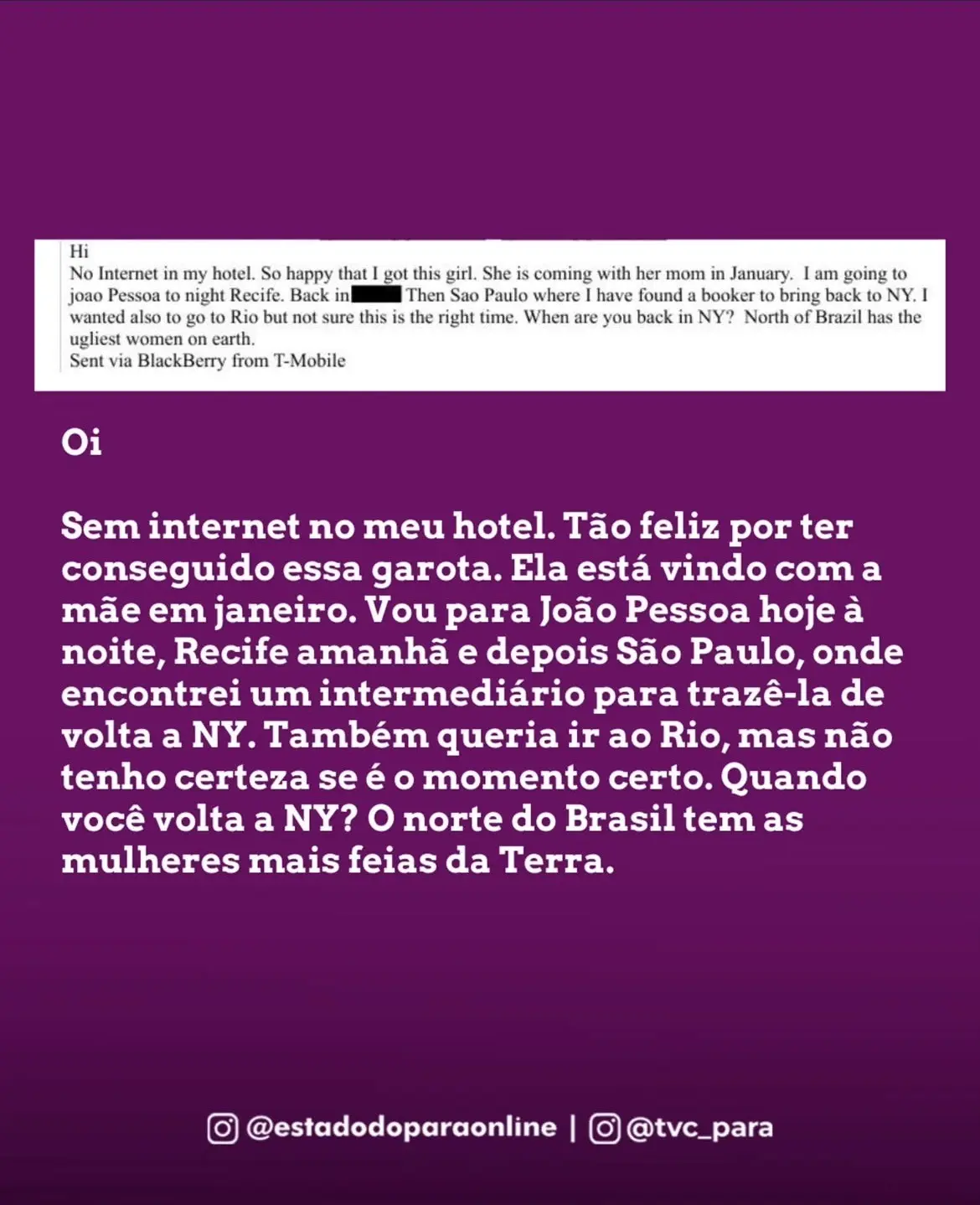 Documentos tornados públicos pelo Departamento de Justiça dos Estados Unidos no âmbito do caso envolvendo o financista Jeffrey Epstein revelaram uma troca de e-mails com declarações ofensivas sobre mulheres da região Norte do Brasil. As informações são do Portal estadodoparaonline.