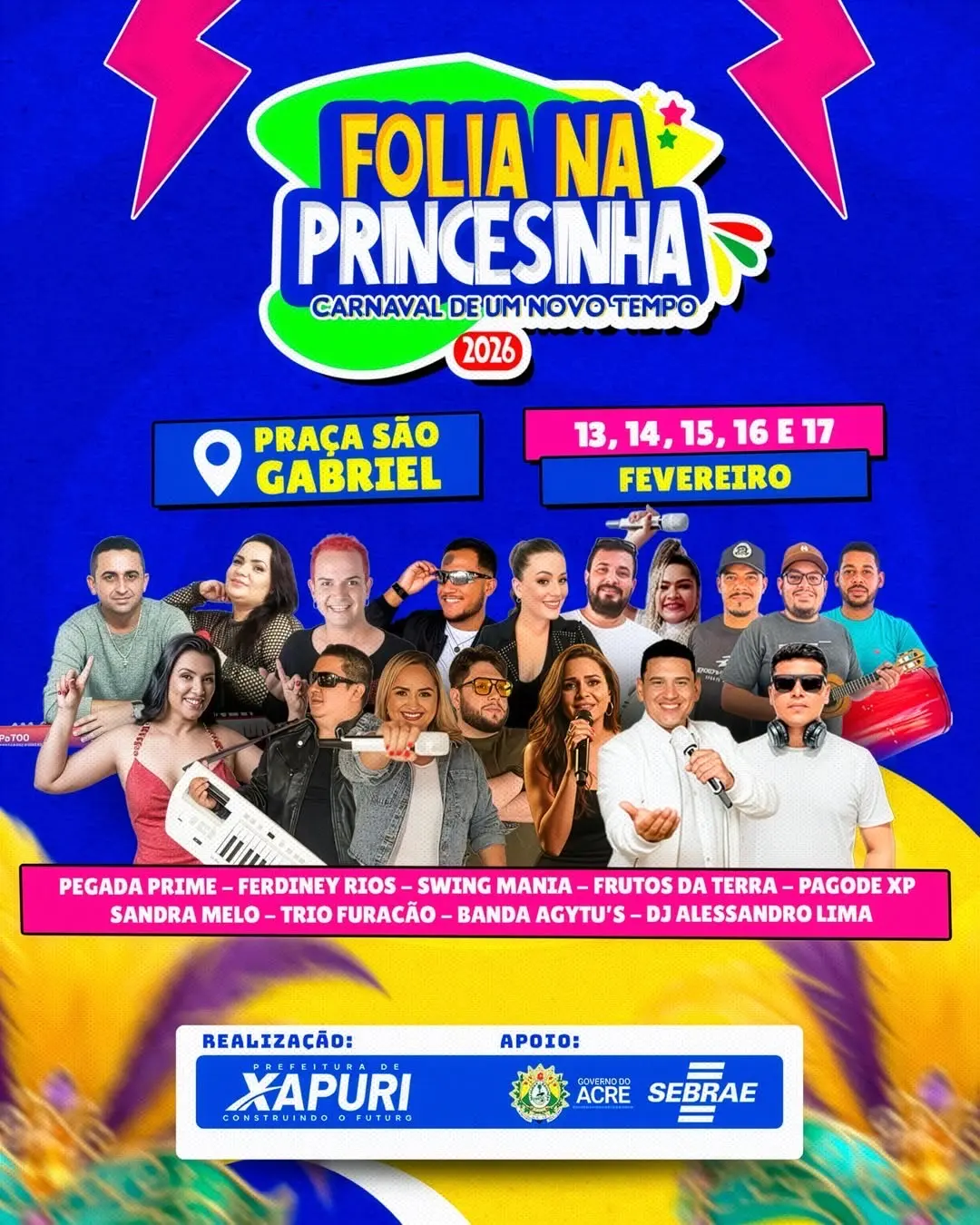 Com o tema “Carnaval de um novo tempo”, o evento prevê apresentações de bandas e artistas de diferentes estilos musicais, reforçando a valorização da cultura local e a tradição carnavalesca no município. O Folia na Princesinha 2026 é uma realização da Prefeitura de Xapuri, com apoio do Governo do Estado do Acre e do Sebrae.