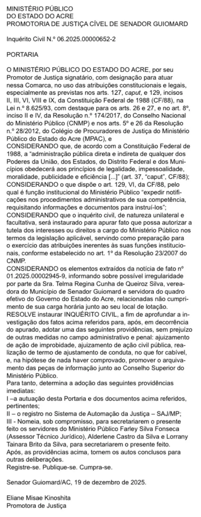 O Ministério Público do Estado do Acre (MPAC), por meio da Promotoria de Justiça Cível de Senador Guiomard, instaurou Inquérito Civil para apurar possível irregularidade envolvendo a vereadora Telma Regina Cunha de Queiroz Silva, do PP, que também é servidora efetiva do Governo do Estado do Acre.