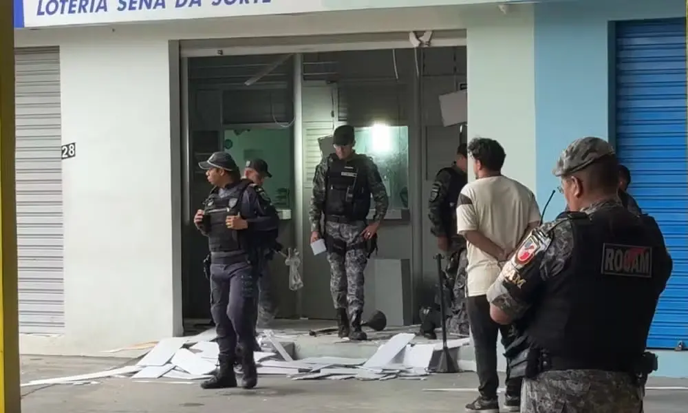 As imagens mostram a dinâmica do crime. Enquanto um dos suspeitos distrai a atendente, o comparsa posiciona um artefato explosivo no interior do estabelecimento. Antes da detonação, os criminosos ainda ordenam que um cliente deixe o local. Com o impacto da explosão, uma das câmeras de segurança chega a cair.