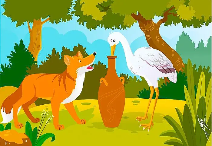 Em outro dia, houve o revide. A Cegonha preparou uma apetitosa e suculenta sopa. Na beira da Lagoa, a Cegonha serviu então a sopa num jarro largo embaixo e estreito em cima.