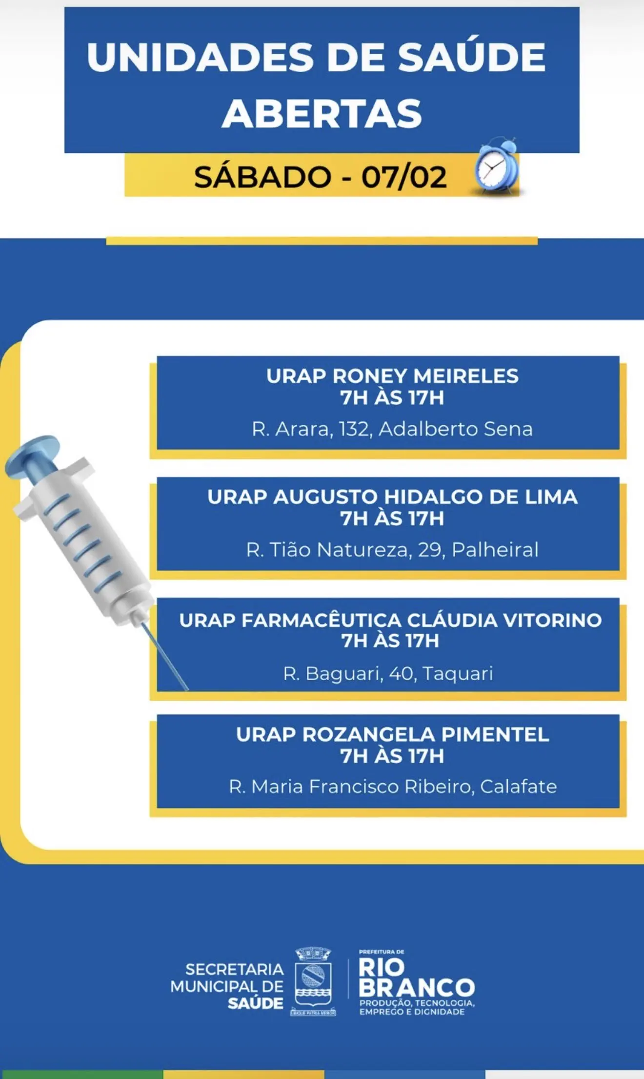 A Prefeitura de Rio Branco mantém quatro Unidades de Referência de Atenção Primária (URAPs) em funcionamento neste sábado, 7, das 7h às 17h, para garantir o atendimento à população.