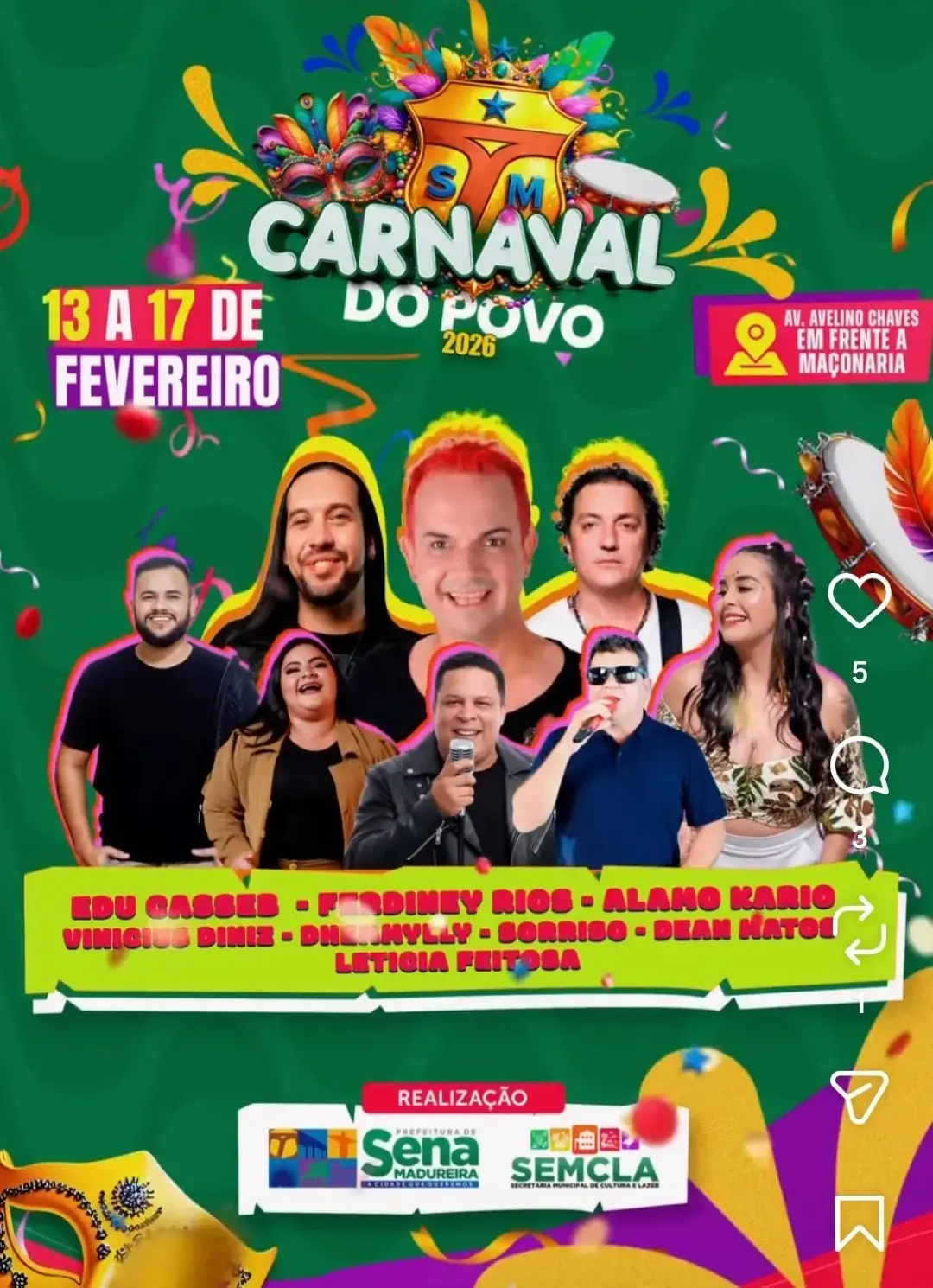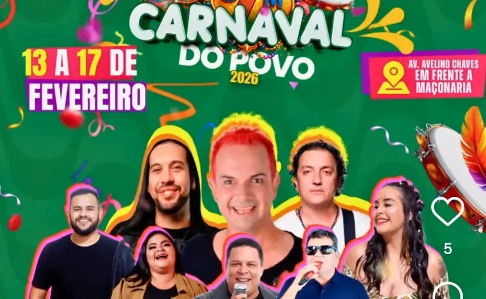 O município de Sena Madureira realiza, entre os dias 13 e 17 de fevereiro de 2026, a programação do Carnaval do Povo, evento que integra o calendário festivo da cidade e reúne atrações musicais nacionais e regionais.