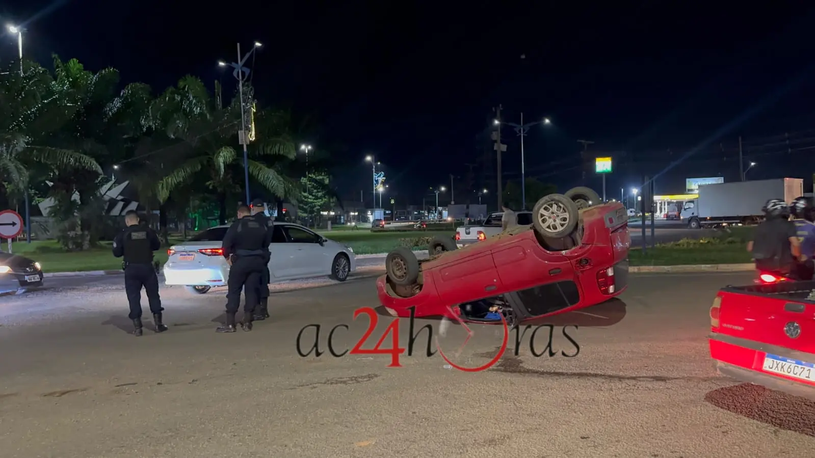 Um acidente envolvendo um Fiat Uno vermelho e um Fiat Strada branco terminou com um dos veículos capotado na noite desta segunda-feira (9), na rotatória da Corrente, localizada na BR-364, no Segundo Distrito de Rio Branco.