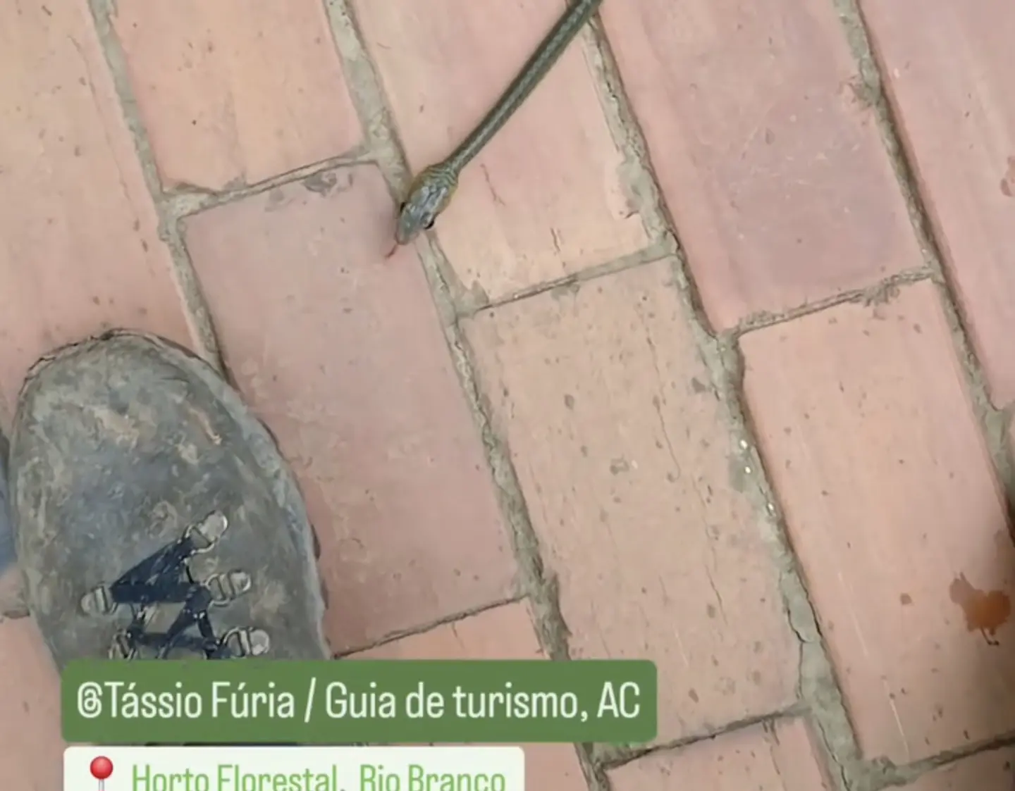 Um encontro tranquilo entre homem e natureza virou conteúdo educativo nas redes sociais neste domingo (8), após o guia de turismo acreano Tássio Fúria publicar um vídeo registrando a passagem pacífica de uma cobra no Horto Florestal, em Rio Branco.