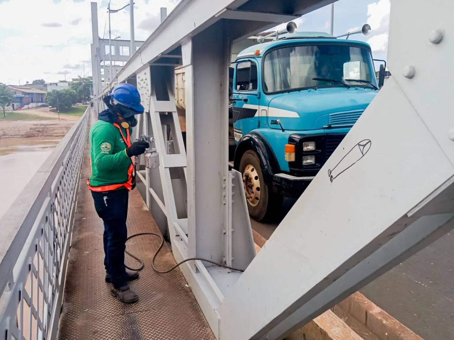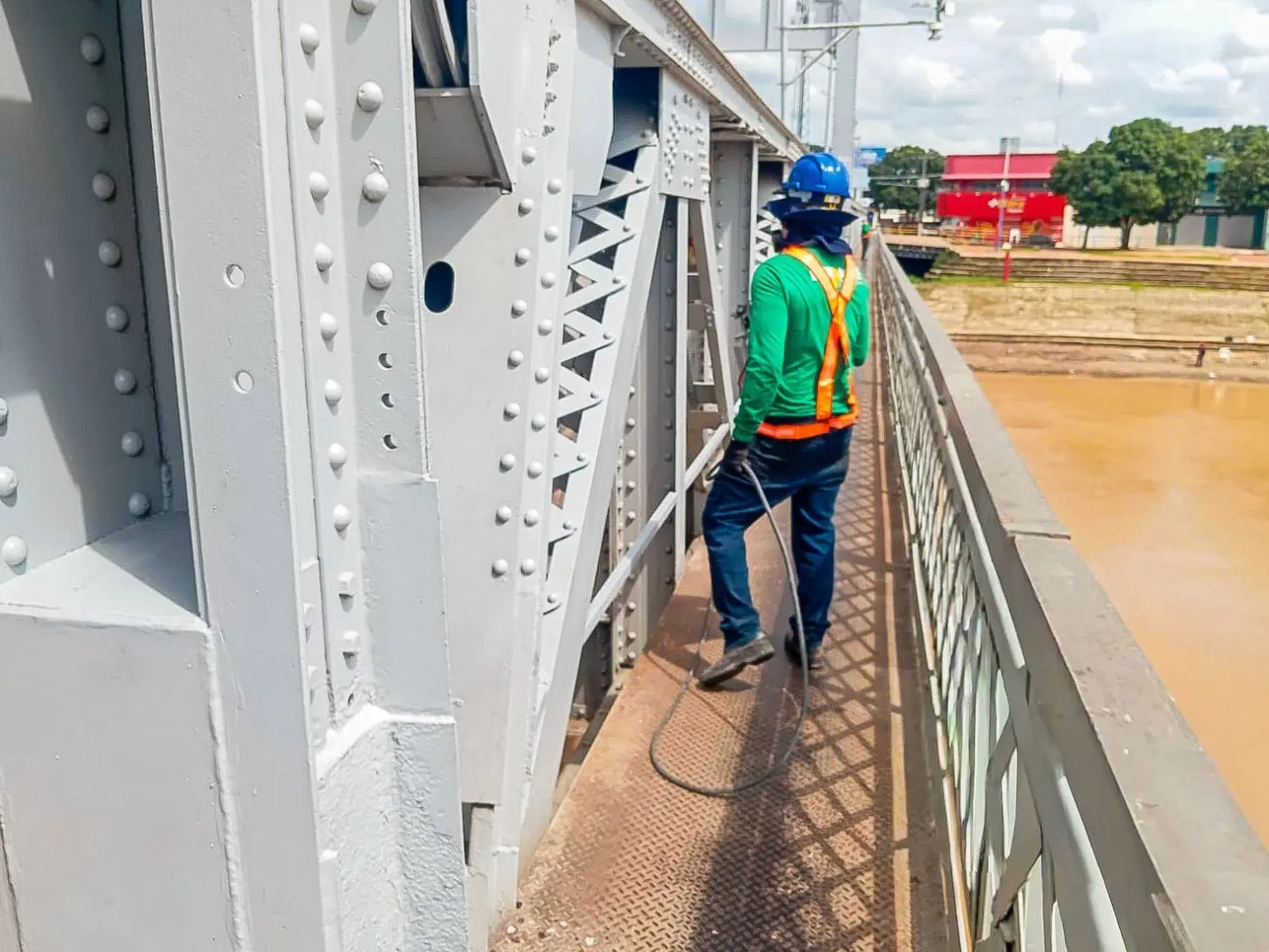 Após o registro de pichações, a Ponte Metálica Juscelino Kubitschek, no Centro de Rio Branco, recebeu serviços de limpeza e pintura para recuperação da estrutura e preservação do patrimônio. A ação ocorreu nesta segunda-feira, 9, com a retirada da tinta aplicada de forma irregular na parte metálica da ponte.