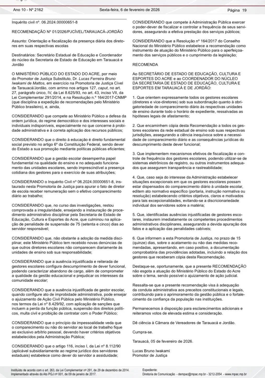 O Ministério Público do Estado do Acre (MPAC), por meio da Promotoria de Justiça Cível de Tarauacá/Jordão, expediu a Recomendação nº 01/2026 no âmbito do Inquérito Civil nº 06.2024.00000651-8, orientando a Secretaria de Estado de Educação, Cultura e Esportes (SEE) a adotar medidas imediatas para fiscalizar a presença diária de diretores e vice-diretores nas unidades escolares.