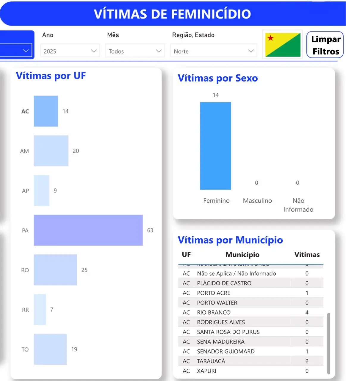 Rio Branco foi o município com maior número de feminicídios no Acre em 2025, concentrando quatro dos 14 casos registrados no estado ao longo do ano — o equivalente a aproximadamente 28,6% das ocorrências. Os dados constam no Sistema Nacional de Informações de Segurança Pública (Sinesp), do Ministério da Justiça e Segurança Pública (MJSP).