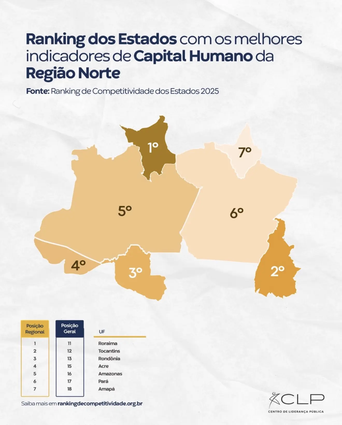 Dados do Ranking de Competitividade dos Estados 2025 colocam o Acre em destaque no recorte regional do pilar de Capital Humano na Região Norte do país. O estado aparece na 4ª colocação, à frente de unidades federativas como Amazonas, Pará e Amapá, em um indicador que mede a qualificação da mão de obra, inserção no mercado de trabalho e impacto na produtividade.