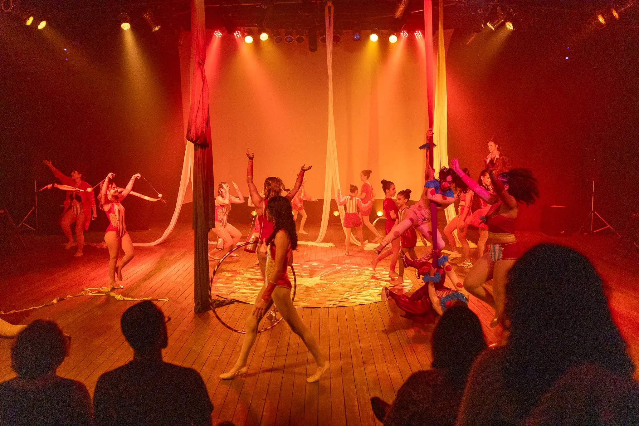 Durante a apresentação, os movimentos aéreos e a ocupação do espaço cênico são utilizados para abordar temas como pertencimento, memória e coletividade, reforçando a relação entre corpo, natureza e criação artística. O tecido deixa de ser apenas um equipamento circense e passa a representar os laços construídos ao longo da história do grupo.
