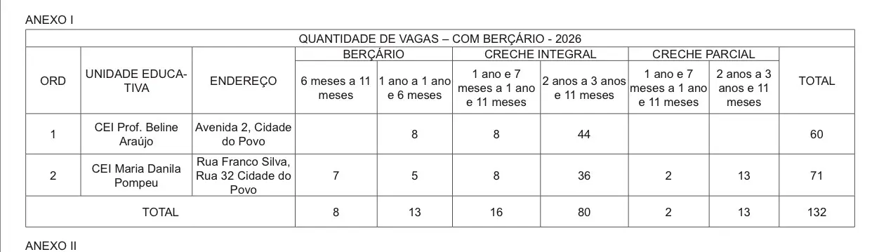 Entre as unidades que ofertam vagas com berçário estão duas: o CEI Prof. Beline Araújo, localizado na Avenida 2, na Cidade do Povo, e o CEI Maria Danila Pompeu, situado na Rua Franco Silva, Rua 32, também na Cidade do Povo. Juntas, as duas unidades somam 132 vagas distribuídas entre berçário e creche, atendendo crianças a partir de 4 meses a 3 anos e 11 meses de idade.