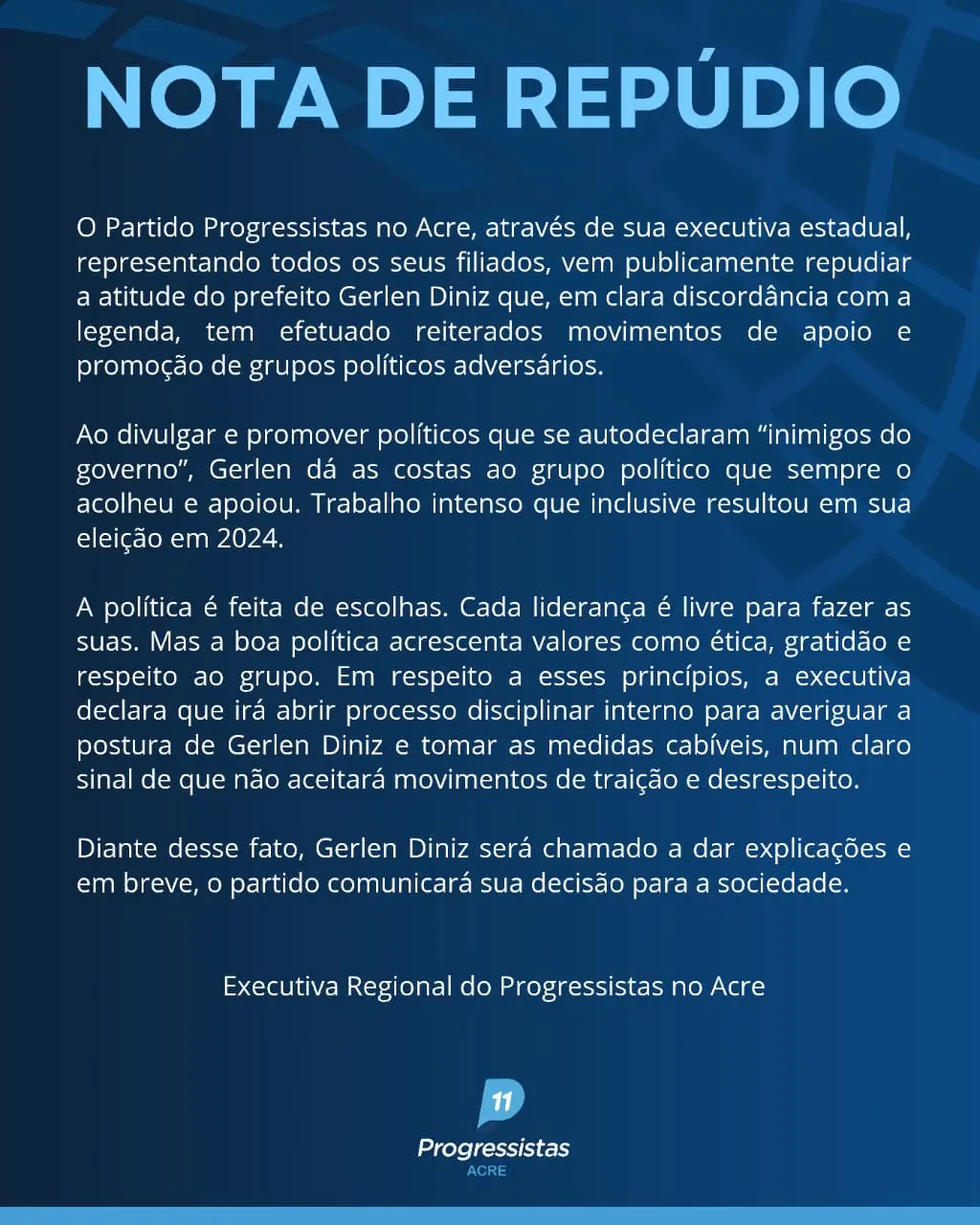 A Executiva Regional do Partido Progressistas (PP) no Acre publicou uma nota de repúdio nesta quarta-feira (11) contra o prefeito de Sena Madureira, Gerlen Diniz, acusando o gestor de adotar uma postura de rompimento político com a legenda e de atuar em apoio a grupos adversários.